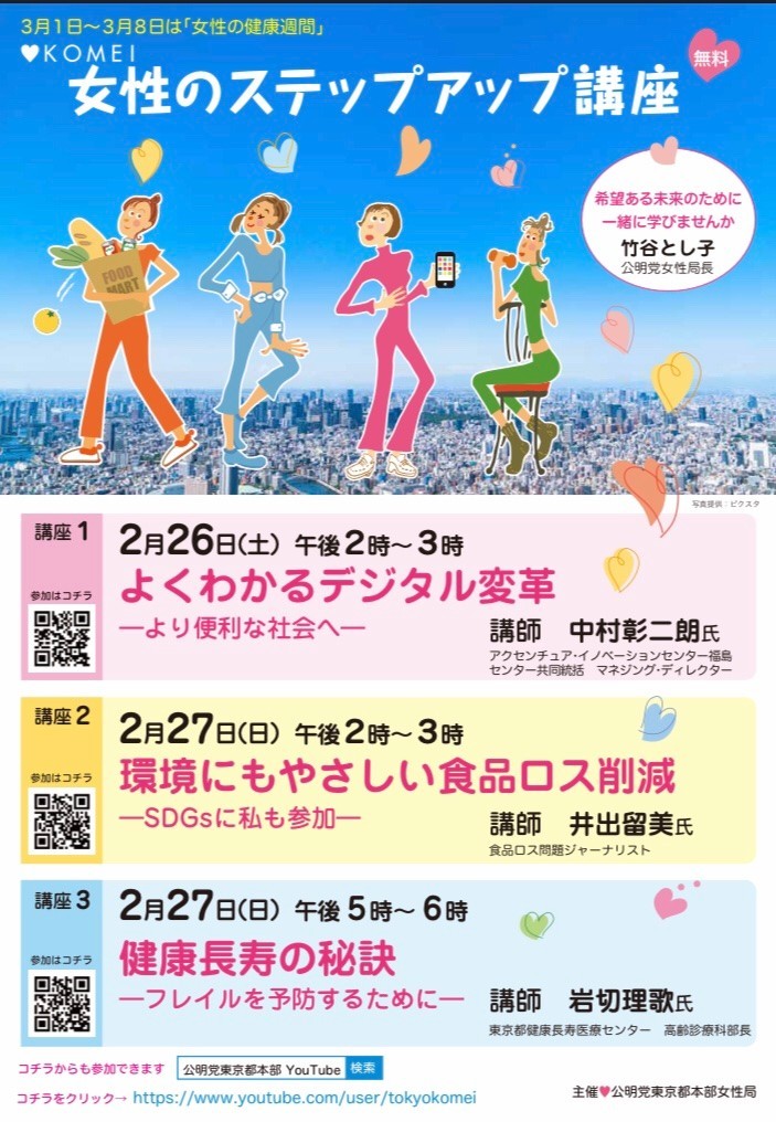 14年目となる本年は、「KOMEI女性のステップアップ講座」と題し、3つのテーマに分けて2/26(土)、27(日)の2日間で、オンラインのライブ配信(Youtube)で開催いたします。
