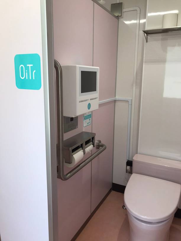 ①個室トイレ内の壁に掲示してあるQRコードを読み取り、アプリを