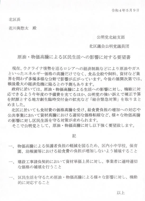 北区では公明党議員団として5月に申入れを行った要望書に沿って、物価高騰の影響を受ける小中学校の給食費補助や高齢者、子育て世代を支援するプレミアム商品券の増額、子育て家事支援用品購入支援の対象拡大を行っていただきました。