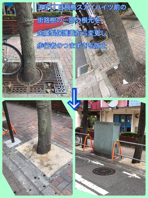 ⭕️王子1丁目の街路樹の根元の金属板につまずき怪我をされた方からのご指摘があり、区に要望。安全対策を講じていただきました。