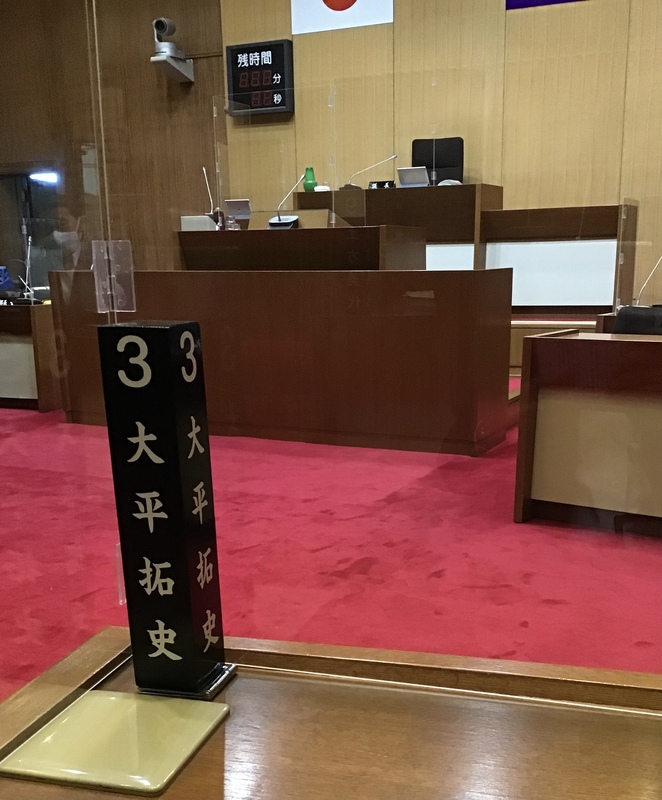 写真:議場内は、コロナ対策として、アクリル板によるパーティションが各席に設置されています。