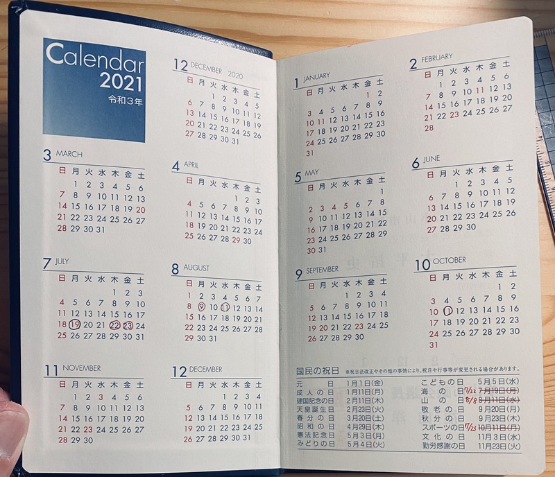 聖火リレーと言えば、今年の夏に行われる予定の東京オリンピック・パラリンピックですが、これに合わせて、2021年限定で3つの祝日が移動しています。この祝日の移動が、2021年のカレンダーやスケジュール帳に反映されていないものがあります。(私がもっているスケジュール帳も反映されていませんでした。写真の市議会手帳のカレンダーは、さっき手書きで祝日を修正しました。)