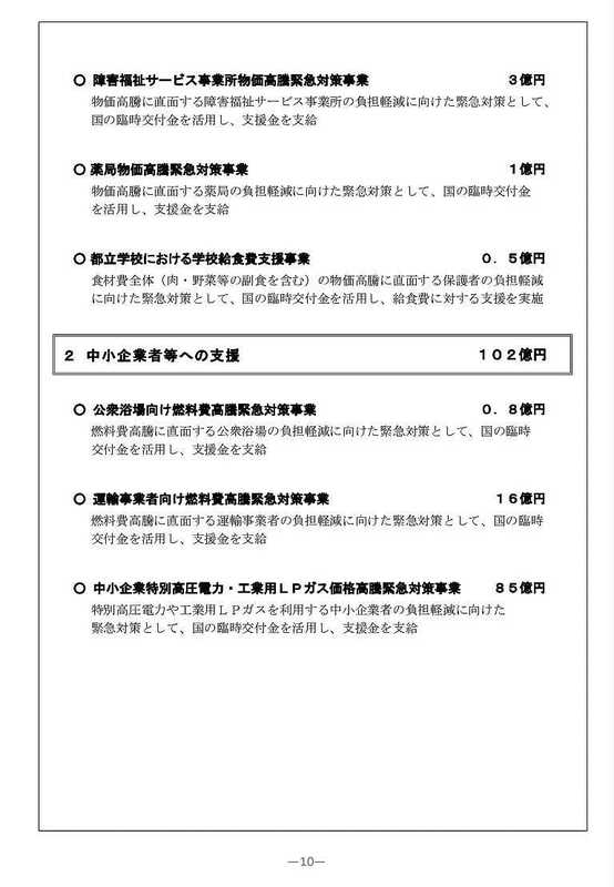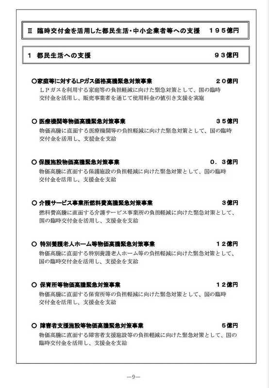 臨時交付金を活用した都民生活・中小企業者等への支援では、LPガスや福祉施設、薬局、公衆浴場など、物価高騰緊急対策事業として、195億円の予算案が盛り込まれております。
