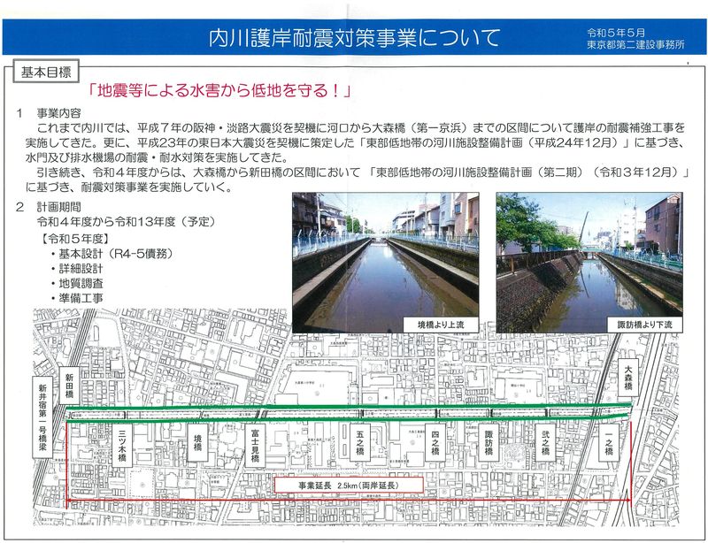 私の地元、大田区の大森西地域を流れる二級河川である内川につきましても河川施設整備計画に基づき、耐震対策が実施されてきております。