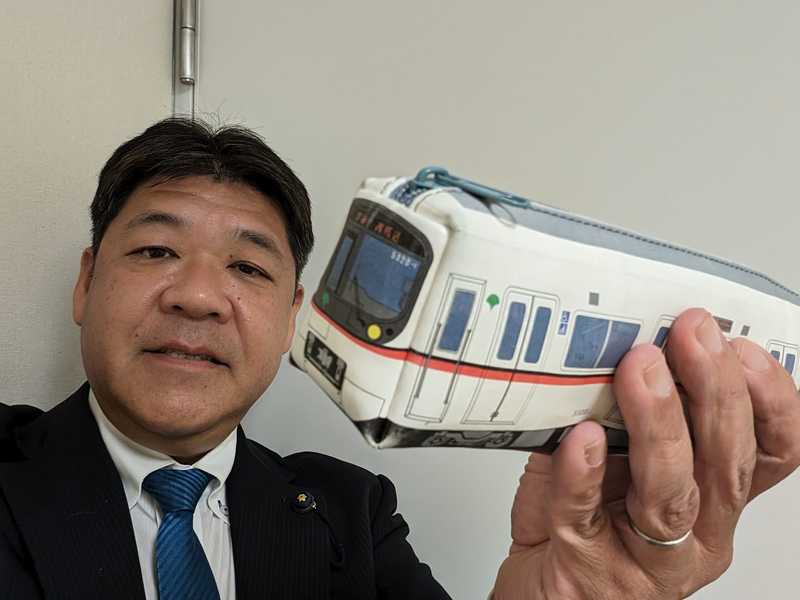 愛用している都営浅草線5300形電車型ペンケースです。2枚目の写真、わたしの机上にも映っています。