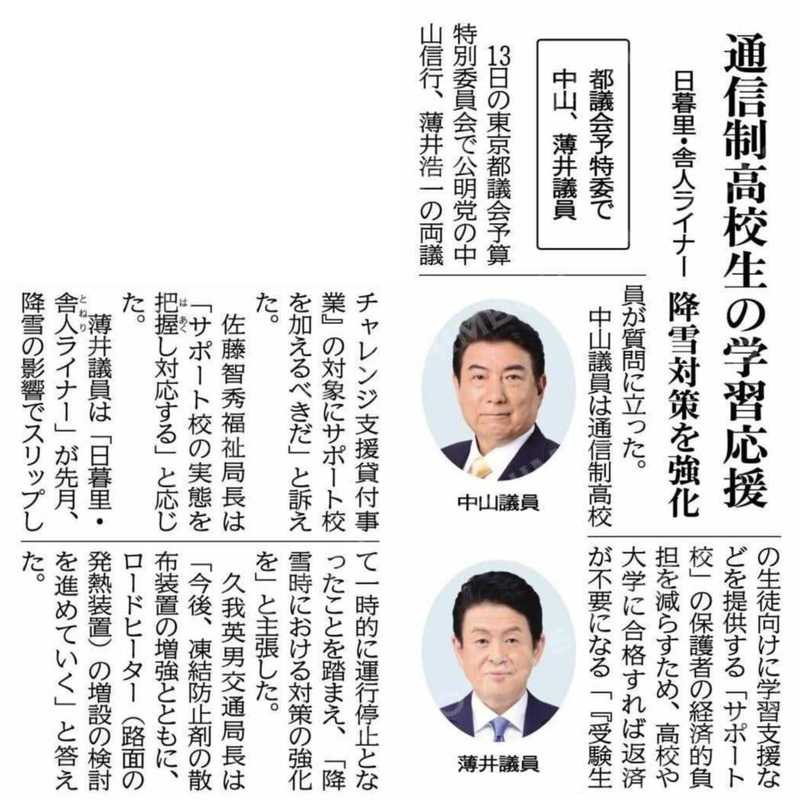 通信制高校生の学習応援/日暮里・舎人ライナーの降雪対策を強化/都議会予特委で中山、薄井議員