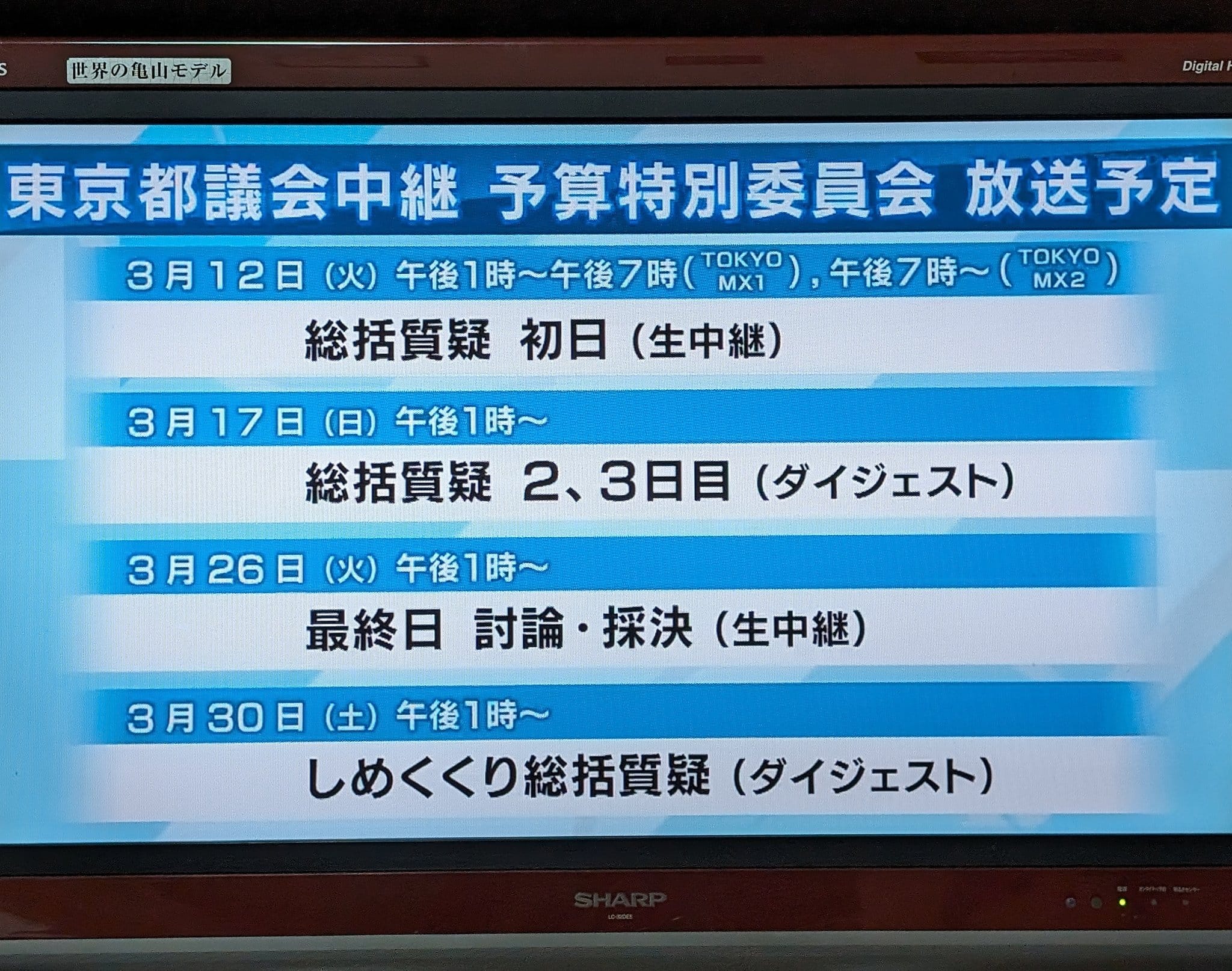TOKYO MX(9ch)では、3/17(日)、総括質疑2、3日目のダイジェストが放送されます。