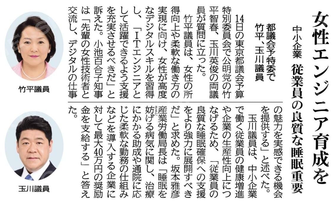 女性エンジニア育成を/中小企業、従業員の良質な睡眠重要/都議会予特委で竹平、玉川議員